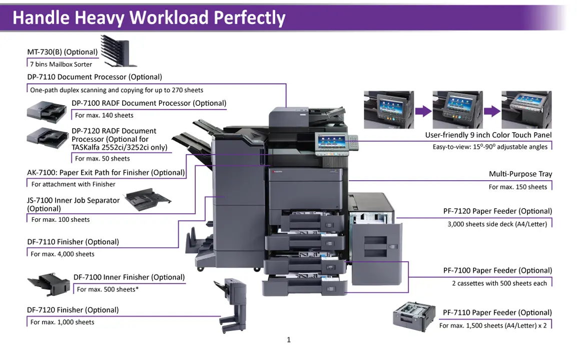 - Maximum: 7,150 sheets (Main Unit + 2 x 1,500 sheets PF-7110 x1 + 3,000 sheets PF-7120 x1 + MPT)