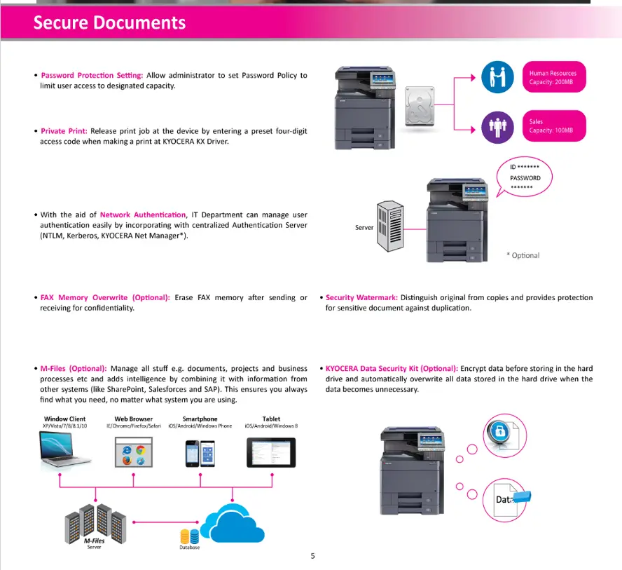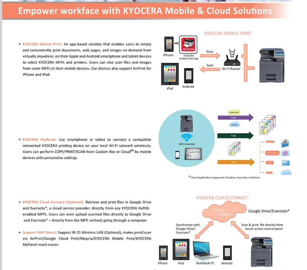 - Mobile Printing: AirPrint, Mopria, KYOCERA Mobile Print
