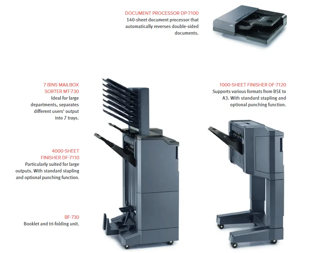 - Optional Accessories: Finisher, Job Separator, Document Processor, Fax System, Card Authentication Kit, Data Security Kit, Wireless LAN Kit, IC Card Reader Holder, Keyboard Holder