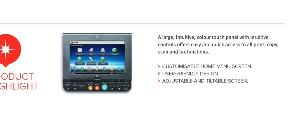 - Print Features: Encrypted PDF Direct Print, IPP printing, E-mail printing, WSD print, Secure printing via SSL, Quick copy, Proof and hold, Private print, Job storage and job management functionality, Airprint